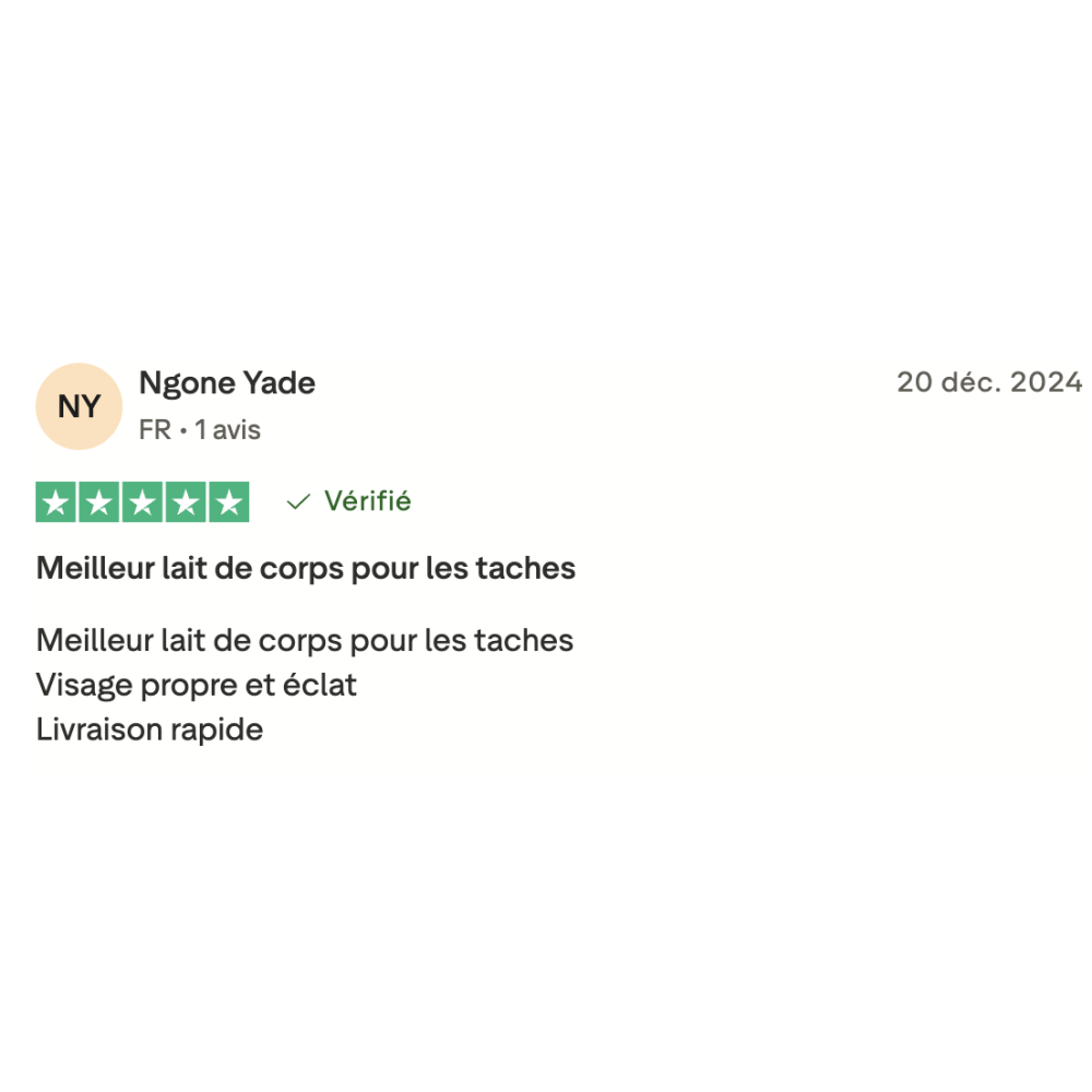 Conseils d'utilisation : Pour des résultats optimaux, appliquez notre Lait corporel éclaircissant sur une peau propre et sèche, en massant doucement. Pour un effet synergique, combinez le avec notre savon exfoliant qui élimine les cellules mortes et prépare votre peau pour une meilleure absorption du lait ainsi que notre sérum carotte, notre Concentré Dépigmentant et Anti-Tache qui vous offre une solution puissante contre les taches brunes et les irrégularités de pigmentation.